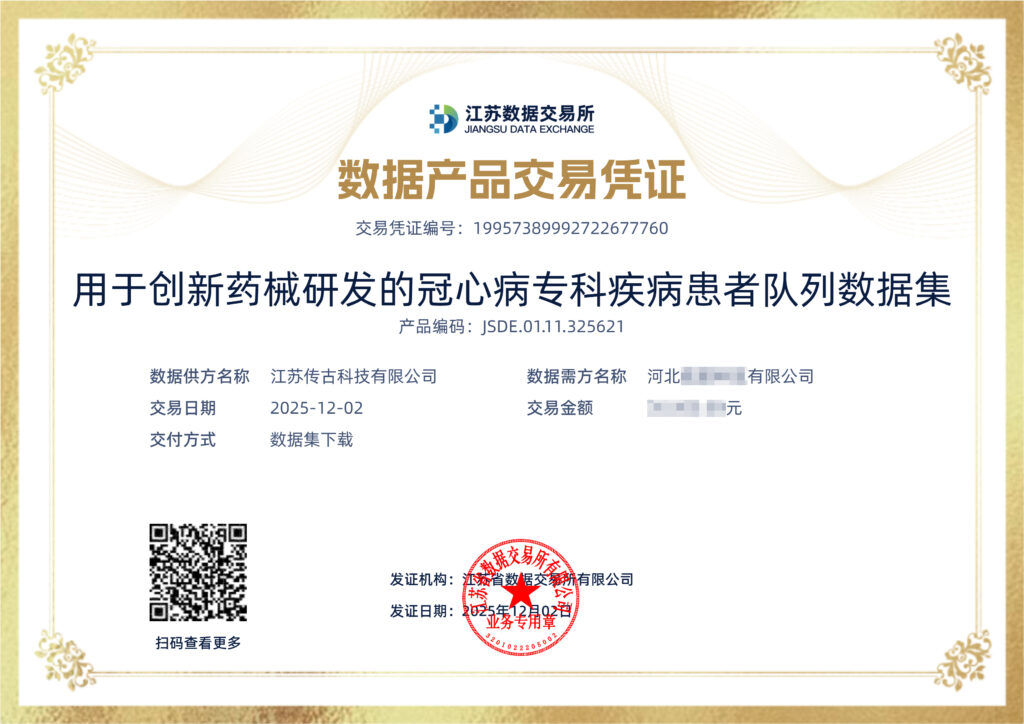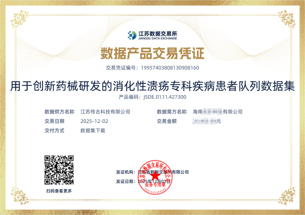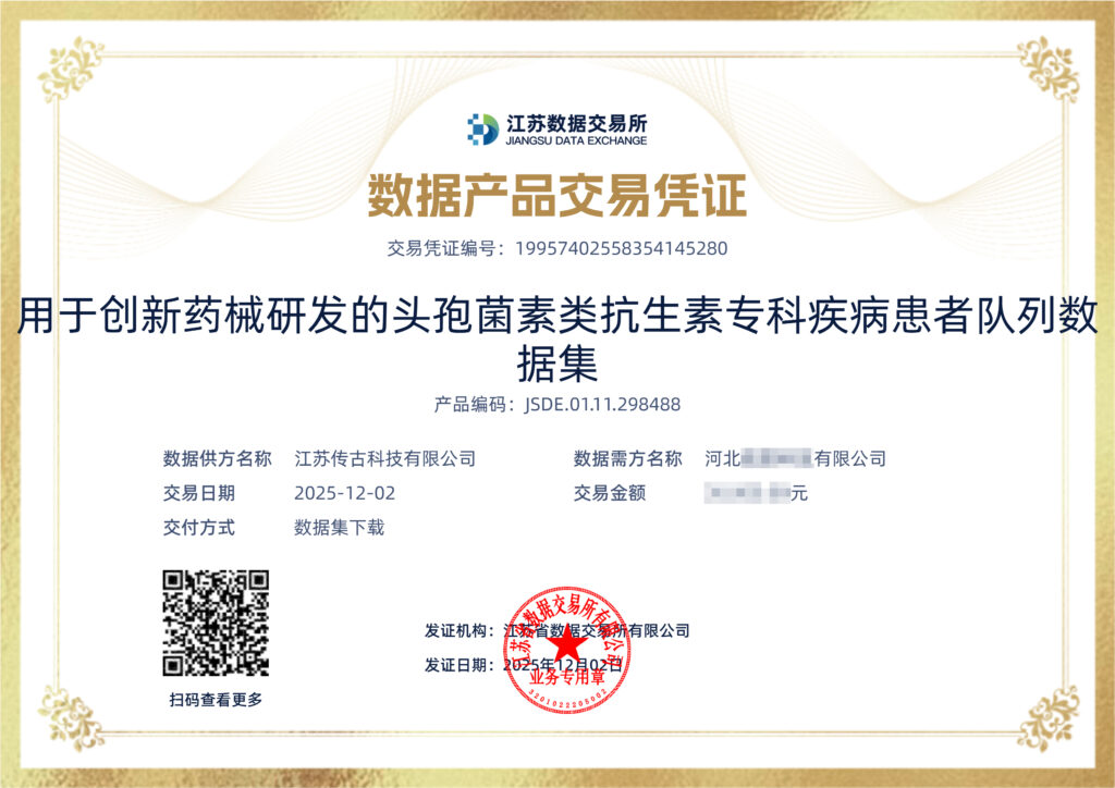 此次交易的顺利落地,离不开传世博润与江苏数交所于2025年7月在南京联合打造的医药服务行业专区,在此过程中,通过行业的可信数据空间,切实保证了数据在传输、存储、使用等全生命周期中的安全性、保密性与完整性,同时严格遵循可信数据交易规范流程,在可信的数据环境基础之下进行交付,从产品上架展示到最终交付验收,每个环节都公开透明、规范有序,确保交易公平公正。江苏传古科技有限公司因提供大量优质交易资源,成功获得江苏数交所数据资源商证书。