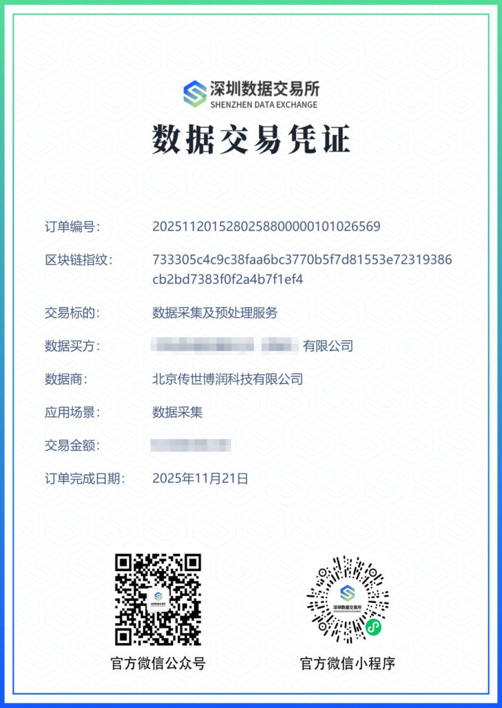 为本次交易提供专业服务是传世博润和深数所于2025年4月在深圳签约的健康医疗数据交易专区,专区充分发挥深数所和传世博润双方的优势,在深数所承担构建安全合规和高效的数据交易环境的基础上,传世博润结合自身数据要素服务能力优势和经验,为医疗健康行业提供“高质量数据集生成、数据资源开发利用形成数据成果、数据成果进一步支持数字医疗成果转化”的一站式服务。